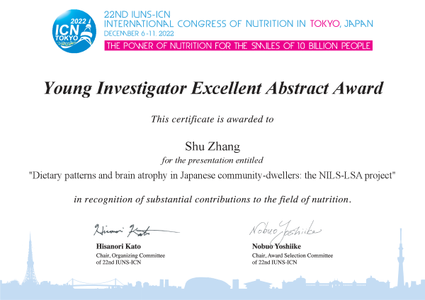 下記の論文が、2022年12月6日から11日に開催された「22nd IUNS-ICN International Congres of Nutrition in Tokyo, Japan」にて「Young Investigator Excellent Abstract Award」を受賞しました。