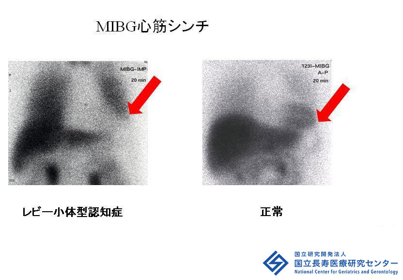 レビー小体型認知症では潜在的に自律神経障害があるため、しばしば心筋が映ってきません。 現在その有効性が全国的に検討されていますが、これまでの報告ではレビー小体型 認知症の90%以上に集積低下がみられると報告されています。