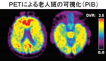 アルツハイマー病の確定診断が可能なPET化合物は存在しません。左図は、ピッツバーグ化合物(PiB)を用いたPETにより老人班の画像化を行った例で
