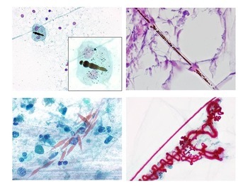 ③(左上)胸水papanicolaou染色:アスベスト小体。透明針状のアスベストに鉄を含む蛋白が取り巻いている。(右上)本年7月下旬に作成された標本内に混入していたコウモリの毛。つくしの茎に似た独特の形状をなす。( 左下) 喀痰細胞診papanicolaou染色:シャルコー・ライデン結晶。(右下)喀痰細胞診papanicolaou染色:クルシュマン螺旋体。