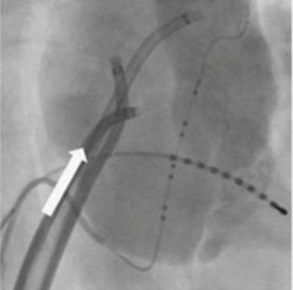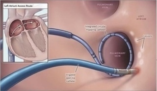 治療用の特殊な電極カテーテルを不整脈の原因となっている組織に密着させ、その先端に高周波を流し、50から60℃に熱します。心臓の筋肉が薄い部分では痛みを感じることがあります。患者によって異なりますが、治療の所要時間はおよそ数時間で入院期間は3泊4日です。一回の手術で7から8割の確率で心房細動が根治し、生涯にわたって心房細動から解放されるといわれています。