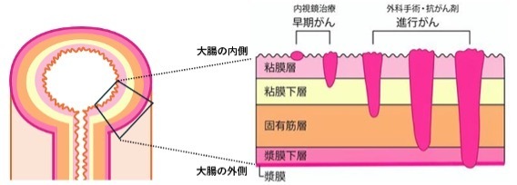 大腸の壁は5層構造であり、がんが起こるときは一番内側にある粘膜という部分にできます。時間が経つにつれてどんどん深いところにまで広がっていき、最終的には一番外側の壁(漿膜)を突き破って周りの臓器に食いついてしまいます (浸潤)。粘膜だけにとどまっているか、粘膜のすぐ下の層(粘膜下層)に顔を出している状態であれば消化器内科の先生が大腸カメラ(大腸内視鏡)の処置で切除することができるため、手術を受ける必要はない場合があります。