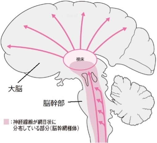 意識の維持は脳幹(生命維持を司る中枢)の上行性網様体賦活系と大脳皮質が連携する事で保たれています(図)。脳のエネルギーは酸素とブドウ糖が主な物で、血流に乗って運ばれ、脳の神経細胞の電気的活動に使われます。脳幹、あるいは両側の大脳の広範囲のエネルギー供給が絶たれた状態や異常な電気活動がおこった場合に意識がなくなる現象が見られる事になります。一時的に意識がなくなると言うことは、これらの部位に一時的に急激な機能障害が起こった事によります。原因が長時間にわたれば、一時的な意識消失ではなく長時間にわたる意識障害が続くことになります。