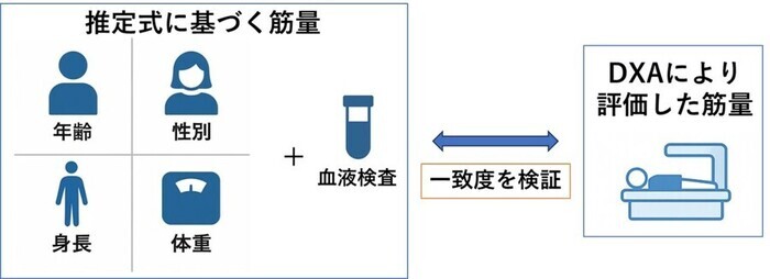 こうした課題を解決するために、簡便で汎用性の高い筋量評価法が開発されてきました。その代表例の一つが、身体測定値や血液検査データなど、日常の診療で取得できる情報を用いた「推定式」です。これまでに多くの推定式が報告されていますが、開発された背景(国、年齢層、人種など)がさまざまであり、日本人高齢者にどの式を適用することが妥当かについては、十分に検討されていませんでした。