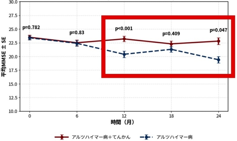 一方で、認知機能低下がかなり進行した段階(図.c)や、ほぼ正常に近いごく早期の段階(図.a)では、両群の間に明確な差は認められませんでした。(図参照)
