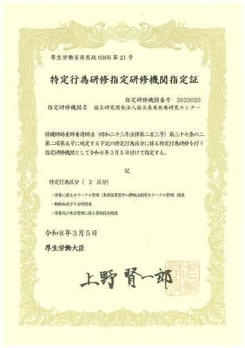 このたび、長寿医療研究センターは、令和8年3月5日付で厚生労働省から「特定行為研修指定研修機関」として指定されました。特定行為研修制度は、保険助産師看護師法に位置付けられた研修制度で、手順により一定の診療の補助を行う看護師を養成するものです。