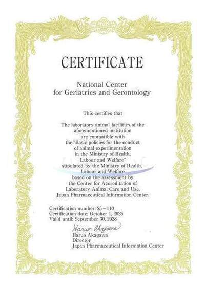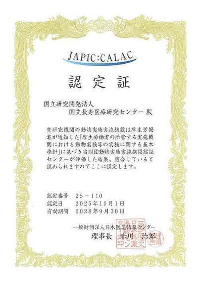 「厚生労働省の所管する実施機関における動物実験等の実施に関する基本指針」に基づき、一般財団日本医薬情報センター 動物実験実施施設認証センターが評価した結果、2025年10月1日に同指針に適合していると認証されました。(2016年、2019年、2022年に引き続き4回目の認証)