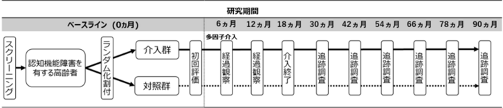 上記5.に記載した基準に該当した対象者をランダムに介入群と対照群に割り付け、両群とも登録時、登録から6、12、18、30、42、54、66、78、90か月時点の経過観察時に、日常生活動作などの総合機能評価と認知機能の評価を行います。
