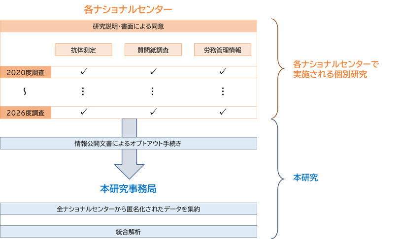 各ナショナルセンターでは2020年度から2026年度にかけて、調査が実施される予定です。各ナショナルセンターで実施される調査は、別途、個別研究として説明と同意取得が行われます。