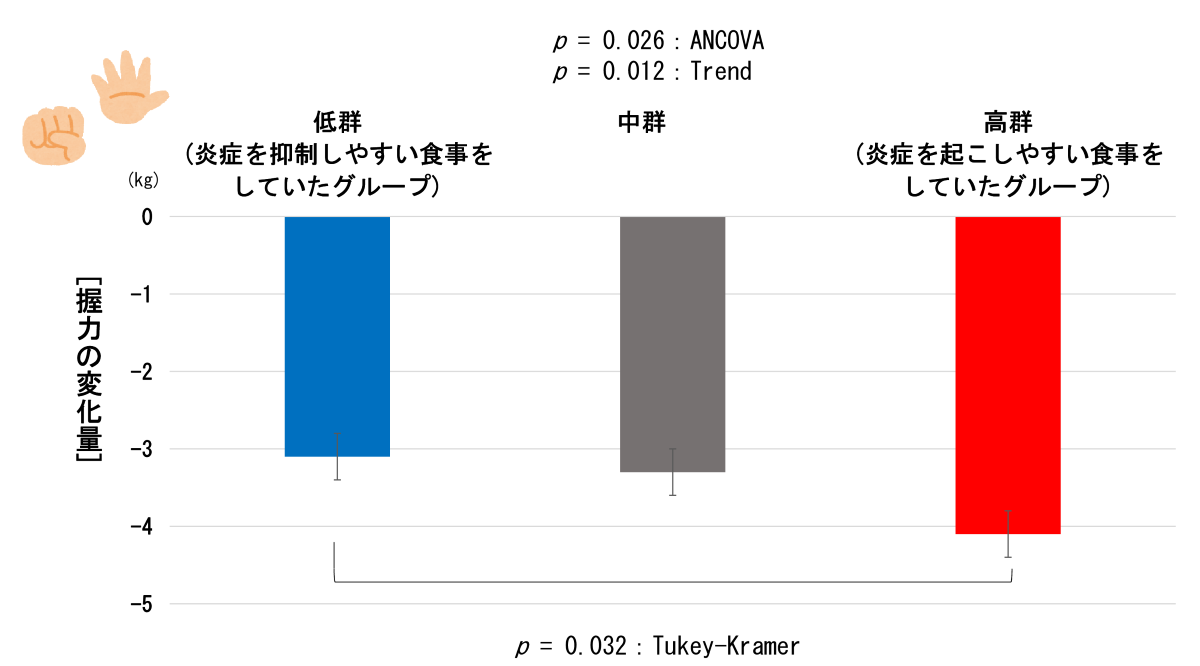 まず第1次調査時の食事内容をもとに、食事性炎症指数(注)を算出しました。そして性・年代(40-59歳および60-79歳)別に、食事性炎症指数の低群・中群・高群という3グループに群分けし、グループ間で約12年間での握力の低下量を比較しました。
