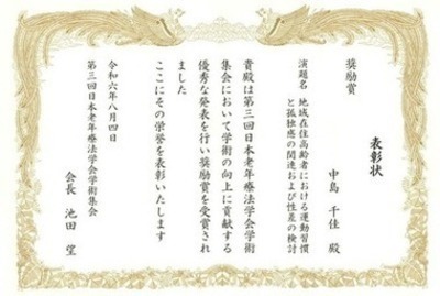 ホーム > 研究所 > ニュース&トピックス > 第3回日本老年療法学会学術集会にて、見須裕香研究員と中島千佳研究員が奨励賞を受賞しました
