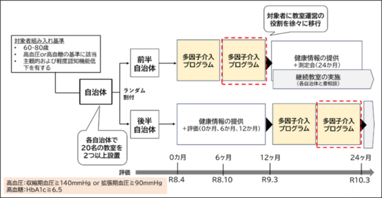 全国の自治体で、60から80歳の高齢者を対象に、高血圧または高血糖の基準に該当し、主観的および軽度認知機能低下を有する方を各20から40名募集し、1年間にわたりプログラムを提供します。研究デザイン上、参加自治体はランダムに前半群と後半群に割付られ、前半の自治体では2026年(令和8年)4月から2027年(令和9年)年3月まで、後半の自治体では2027年(令和9年)4月から2028年(令和10年)3月まで、順次プログラムを提供します。さらに、1年間のプログラム終了後に、参加者自身が教室運営に関わる「継続教室」を取り入れ、地域に根付いた持続的な取り組みへと発展させていくことも予定しています。また、本研究では、7月15日のプレスリリース