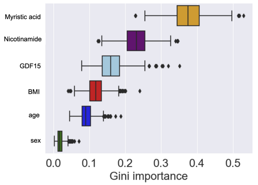 なかでもミリスチン酸は、最も高い重要度指数(ジニ係数)を示し、診断マーカーとしての有用性が示唆されました。栄養素として補充可能である点から、将来的な治療介入への応用も期待されます。