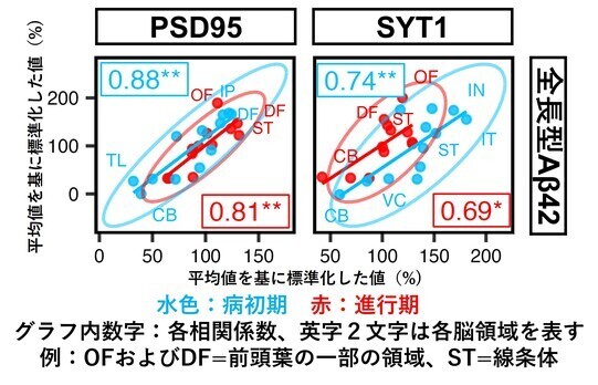 本研究では、東京都健康長寿医療センターで保管している剖検脳をあらたに用いて、全長型Aβ42と神経シナプスに関連する分子であるPSD95とシナプトフィジン(SYT1)の脳内の分布をELISA法(注5)で測定すると、病初期から高い相関係数(注6)を示す、つまりそれらの分布が類似していることをまず再確認しました(図1)。