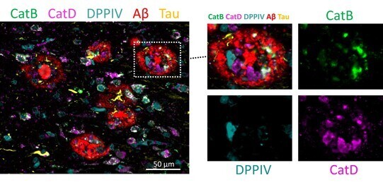 図3.アルツハイマー病患者脳内でのカテプシンやジペプチジルペプチダーゼの異常発現(右側の拡大図で示しているのは、赤色のAβコア(中心核)の周囲に、CatB(緑色)やDPPIV(シアンブルー色)、CatD(紫色)が通常とは異なる形で存在する様子である。タウ蓄積(黄色)もその近傍に存在することが分かる)