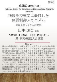 ホーム > 研究所 > イベント・セミナー > ジェロサイエンス研究センター > 第5回GSRCセミナー「神経免疫連関に着目した痛覚制御メカニズム」