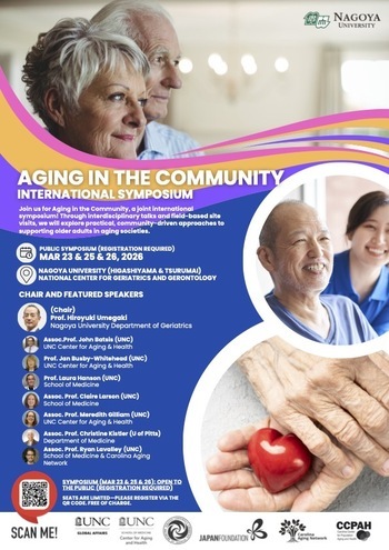名古屋大学大学院医学系研究科(医学部)と米国ノースカロライナ大学チャペルヒル校(University of North Carolina at Chapel Hill:UNC–Chapel Hill)は、両大学の連携のもと、国際共同プログラム「Aging in the Community」を実施いたします。両機関はこれまで、高齢者医療および地域ケア領域を中心に、研究・教育の両面で継続的な交流を行ってきました。2025年にはUNCにおいて、日米合同シンポジウム「Aging and the Family」を開催し、医学、看護学、公衆衛生学、社会福祉学など多領域の専門家が集い、超高齢社会における高齢者および家族への支援の在り方について活発な議論を行いました。本年度は、その第2フェーズとして名古屋大学がホストとなり、地域を基盤とした高齢者支援(Aging in the Community)をテーマに、本国際シンポジウムを開催いたします。